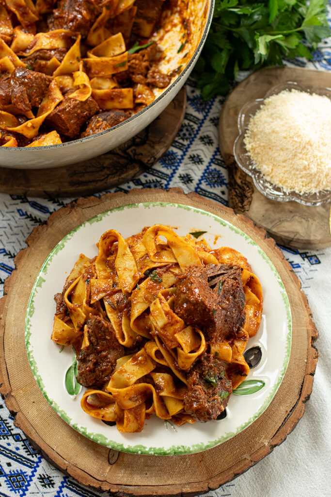 Cook the pappardelle in well-salted boiling water until al dente. Drain the noodles, then either stir them directly into the stew or spoon the stew generously over the pasta.