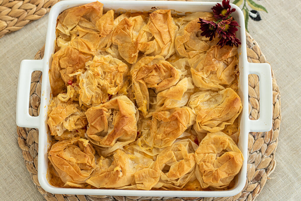 A Mediterranean twist on classic chicken pot pie! Tender roasted chicken, roasted red peppers, and melted cheeses come together in a creamy, flavorful filling that’s rich and comforting like American pot pie — but with a Greek flair. Top it with golden puff pastry for an easy, flaky finish or use ruffled phyllo sheets for a lighter, crispy alternative. This cozy one-dish meal is perfect for family dinners or holiday gatherings.