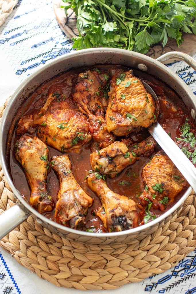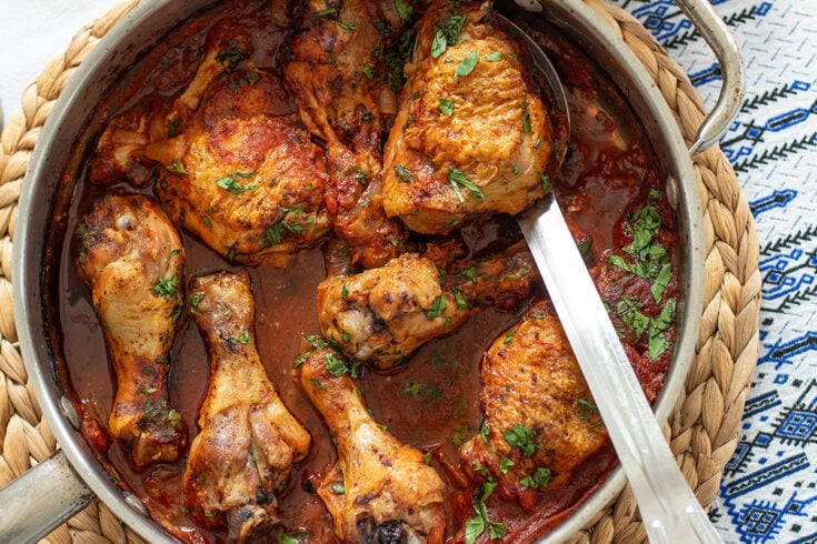Bone-in, skin-on chicken thighs and drumsticks – The bones add depth and richness to the sauce while keeping the meat incredibly juicy during baking. Boneless thighs can be used, but reduce the baking time slightly.