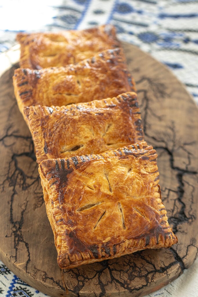 Shapes: Rectangles are my preferred shape for these mini kotopitakia because they eliminate puff pastry waste and make assembly faster. Each 15 x 10-inch puff pastry sheet can be cut into 12 equal rectangles with no scraps.