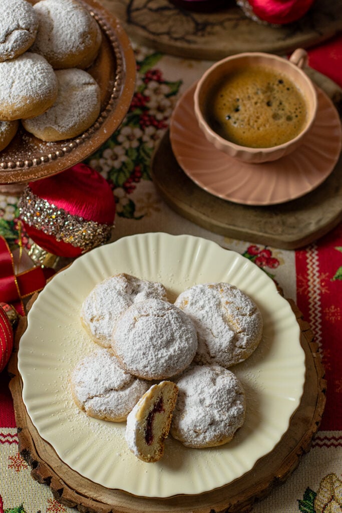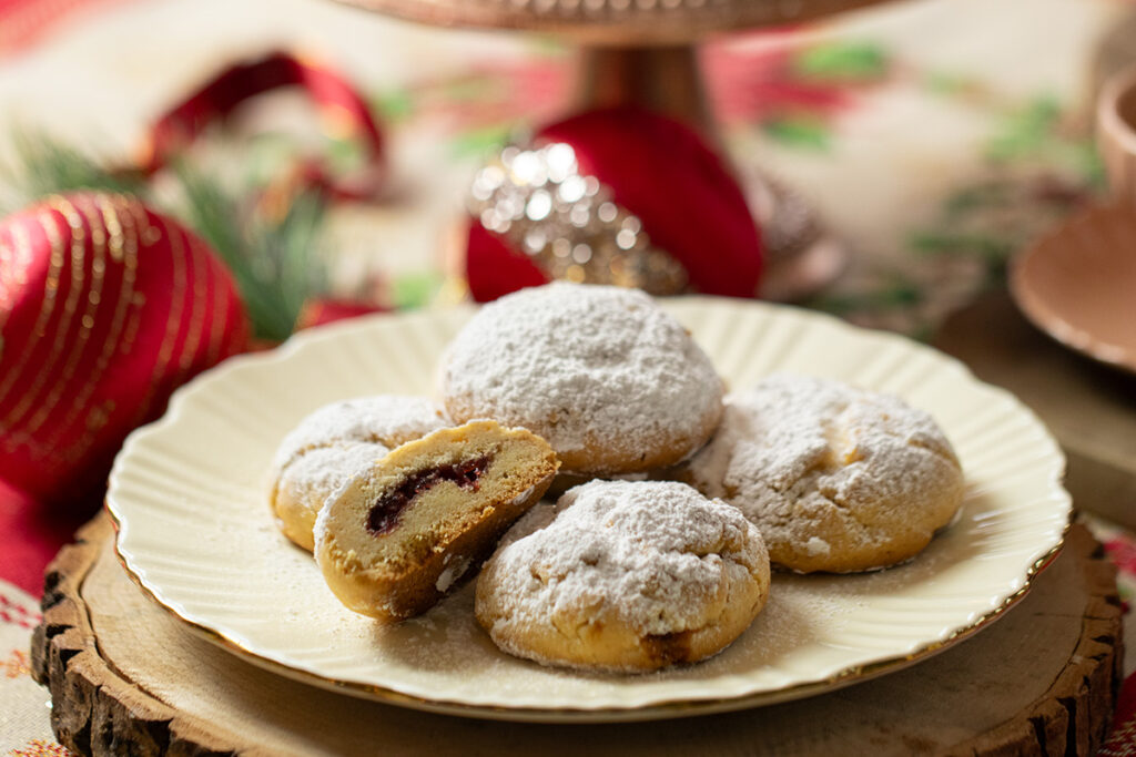 There’s something so nostalgic and comforting about kourabiedes during the holidays. They’re one of those cookies that instantly signal Christmas in a Greek home — buttery, crumbly, and generously dusted with powdered sugar. This version is a little twist on the classic, filled with a jewel-like spoonful of raspberry preserves that adds color, brightness, and just the right amount of tartness.