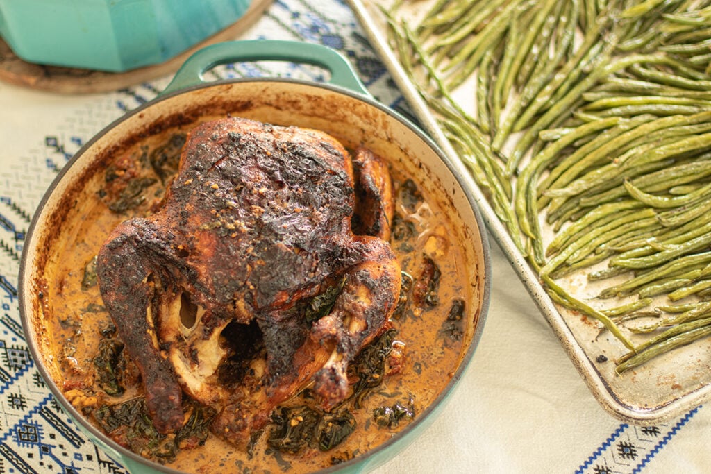 Pour the sauce into the roasting pan around the chicken. Spoon a little of the sauce over the chicken, then return the pan to the oven. Roast for an additional 10–15 minutes, until the sauce is bubbling and the flavors have melded.