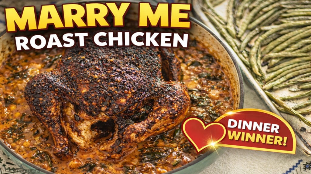 If you love a comforting roast chicken dinner with bold Mediterranean flavor, this creamy “Marry Me” chicken delivers every time. The crispy, herb-rubbed skin gives way to tender meat, while the garlicky sun-dried tomato cream sauce turns simple roast chicken into something worthy of guests, and to make it a little more Mediterranean, I add spinach and feta. It’s rustic, impressive, and surprisingly easy — the kind of recipe that feels like you worked all day (even if you didn’t).