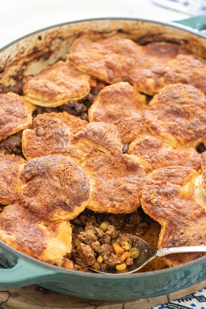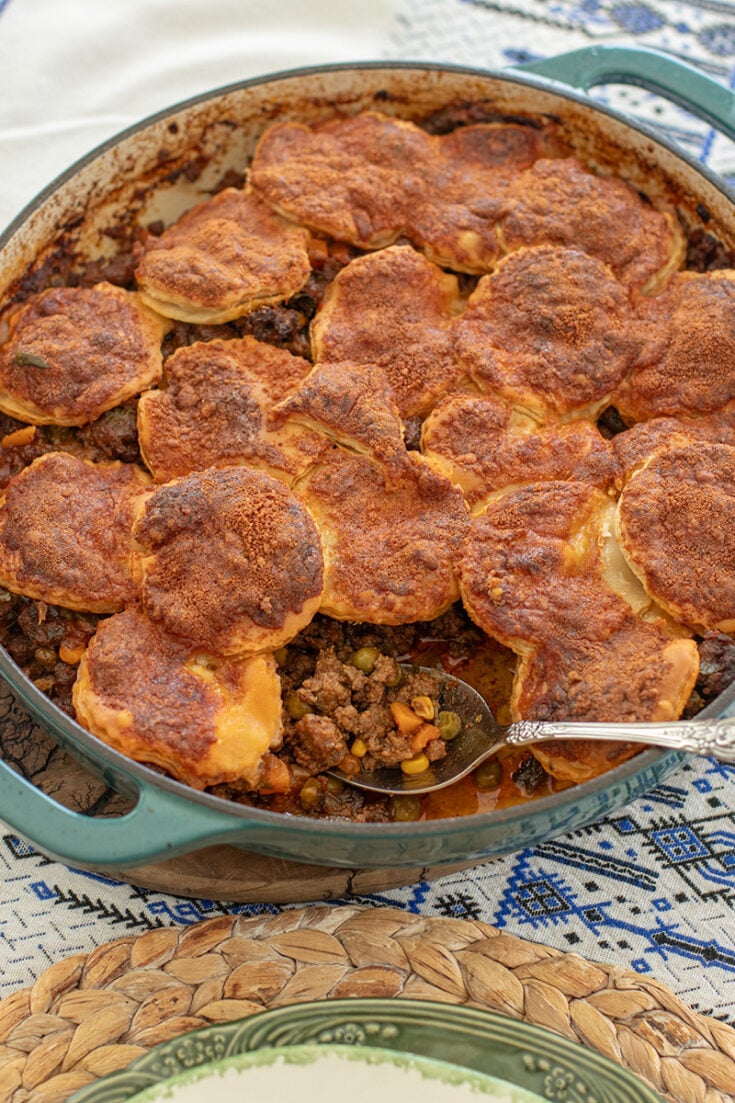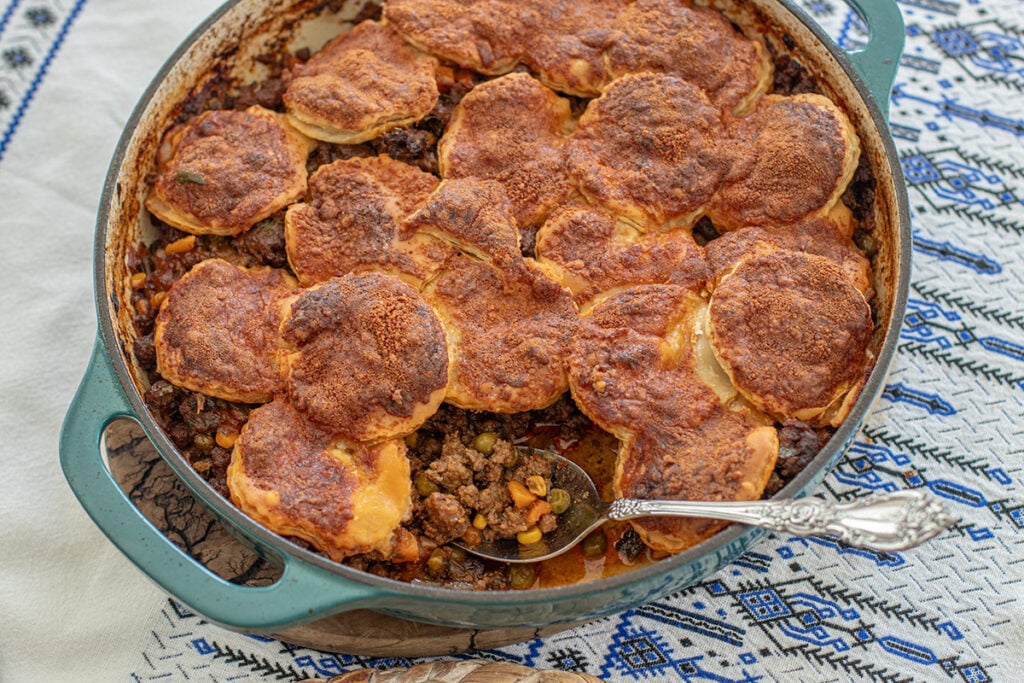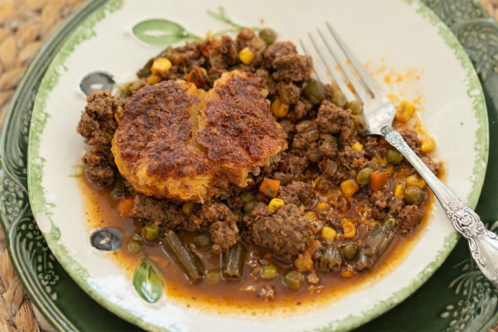This skillet ground beef pie is simple comfort food done right. Savory ground beef cooked with onions, garlic, herbs, and a splash of balsamic for depth, then topped with flaky puff pastry and baked until golden. It’s easy, satisfying, and perfect for a cozy dinner or casual hosting.
