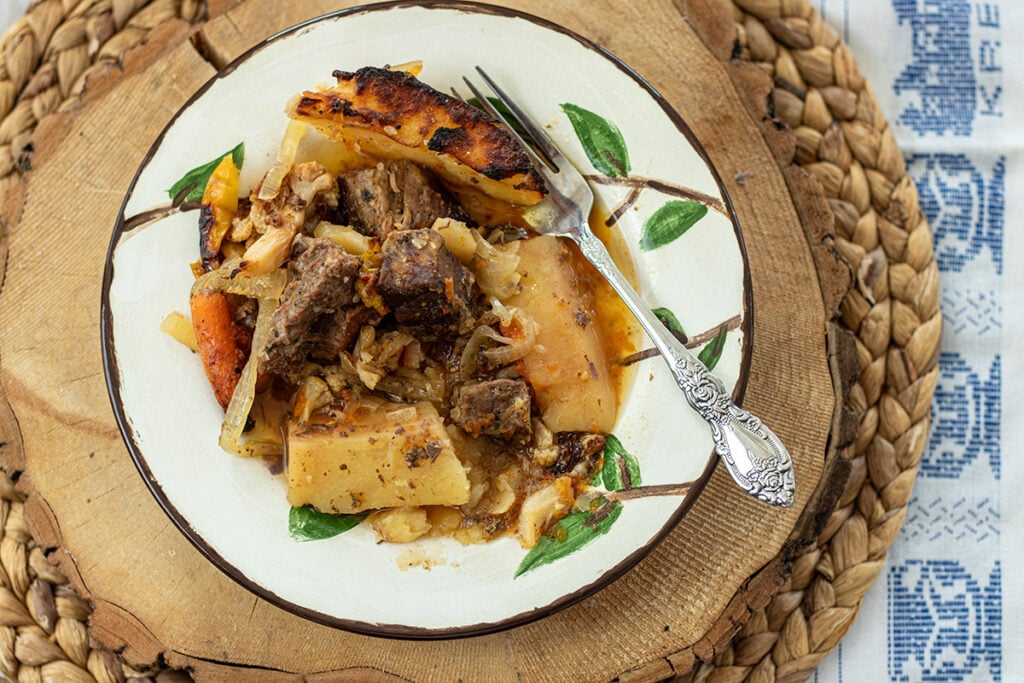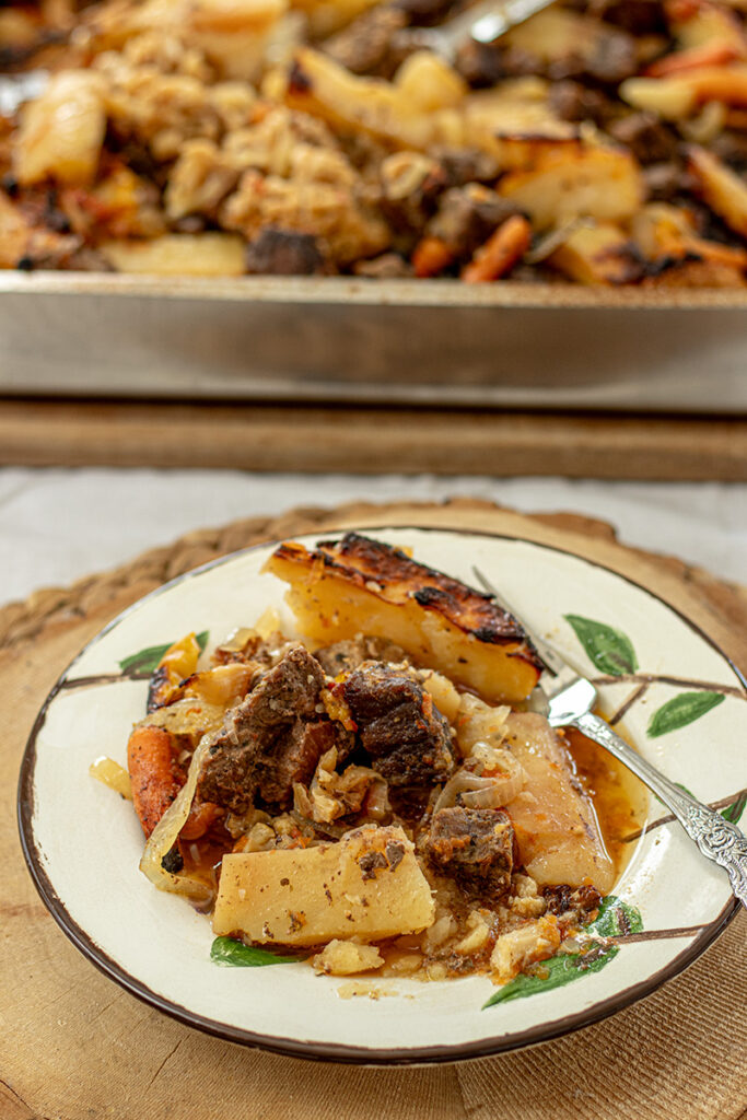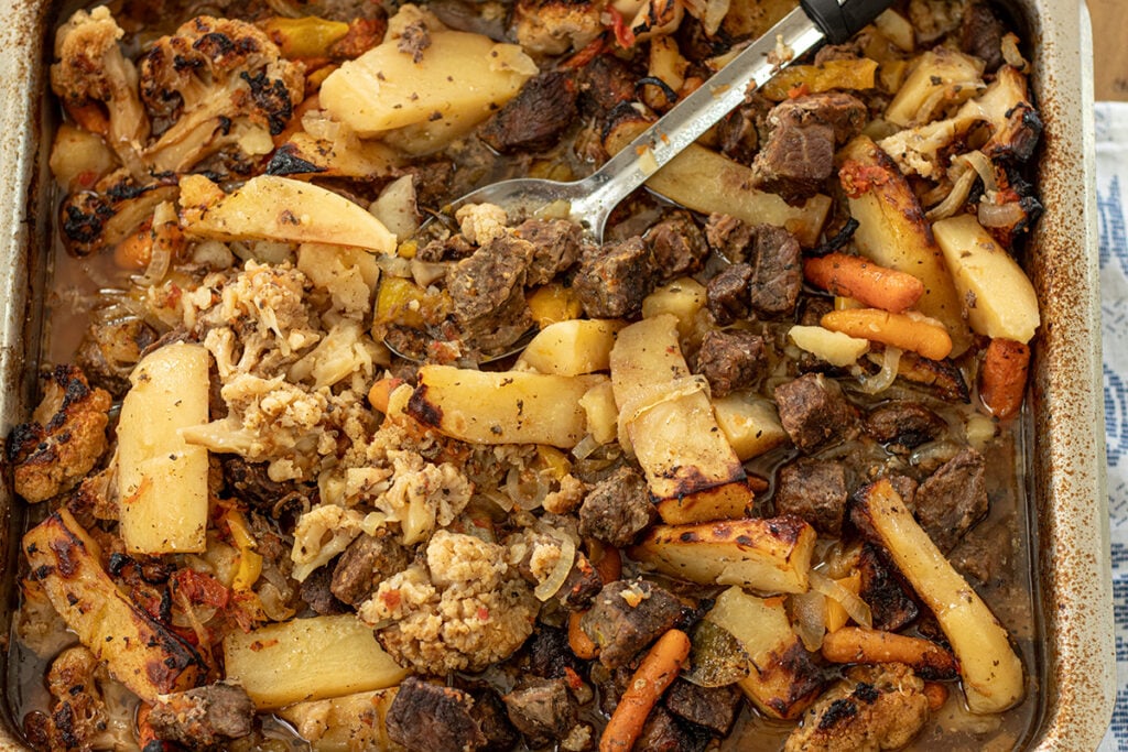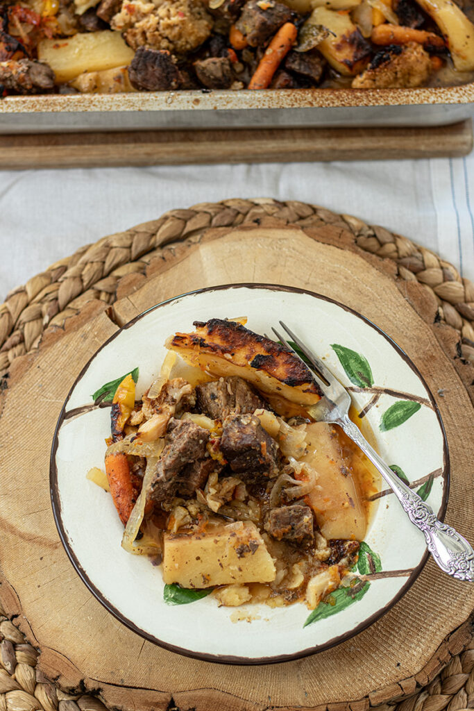This slow roasted beef and vegetable bake is a cozy, one pan Greek-style dinner made with tender beef cubes, potatoes, onions, peppers and cauliflower. Everything roasts together in a rich tomato and garlic sauce until melt-in-your-mouth tender. Perfect with toasted bread and a crisp salad.